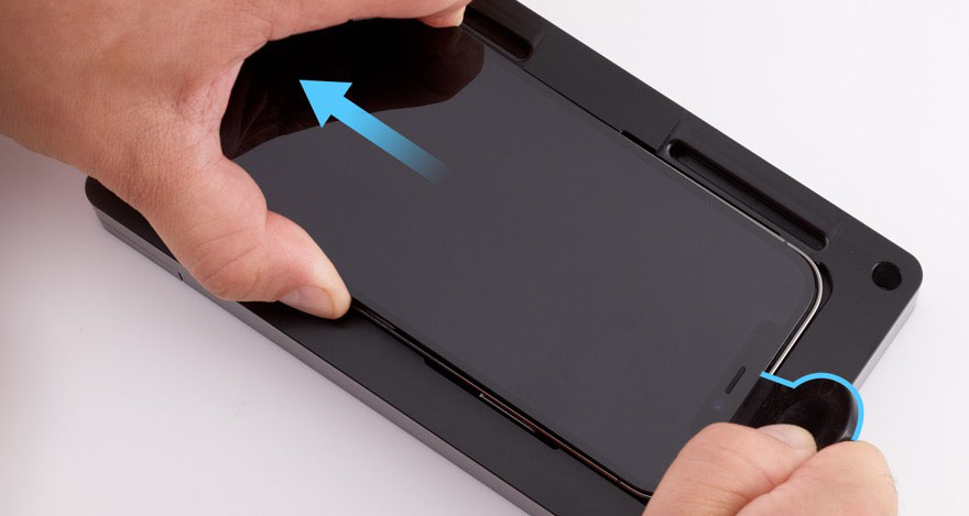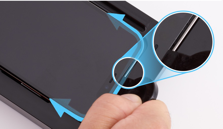 Insert the edge of the adhesive cutter between the display and the enclosure. Run the cutter between the display and the enclosure to the right and left as shown until the display partially releases from the enclosure.