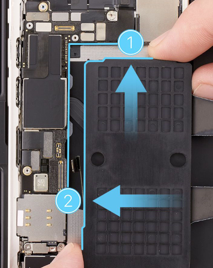 Caution: When using the black stick to remove the battery from the enclosure, don’t damage the flex cables. Don’t scrape, rip, tear, or otherwise damage the polyester film or other areas. If damage occurs, replace the iPhone.
