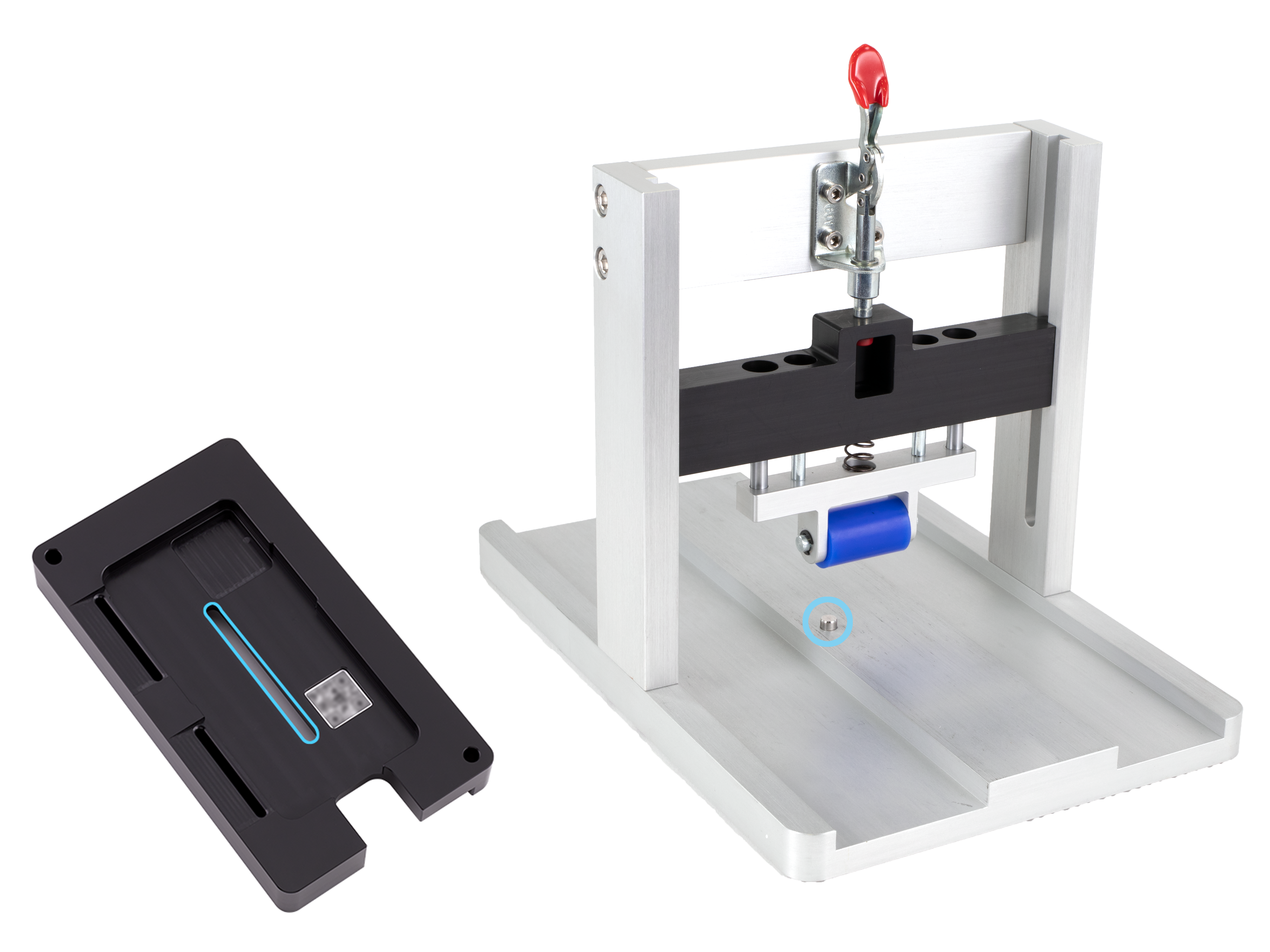 The center of the repair tray has a slot. Position the repair tray and enclosure onto the battery press with the slot over the pin.