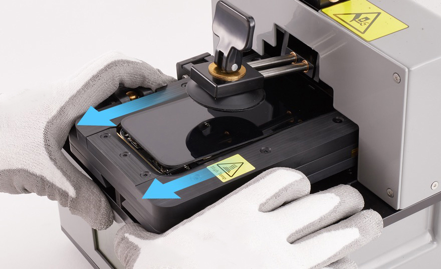 Place the enclosure in the repair tray with the display faceup and the Lightning connector facing the cutout. Remove the gloves.