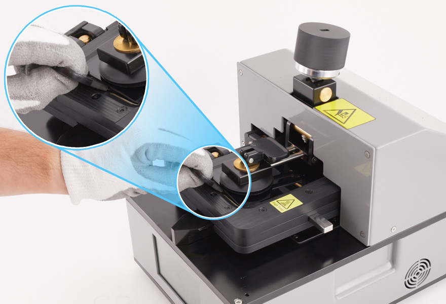 Put on the heat-resistant gloves. Align the cutout on the bottom of the pocket with the rail on the fixture. Slide the pocket with the iPhone onto the rail on the fixture.
