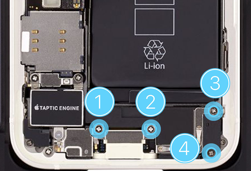 Rotate the repair tray. Use the green torque driver and JCIS bit to install four new crosshead screws into the speaker (923-05012) (1, 2) (923-05013) (3, 4).