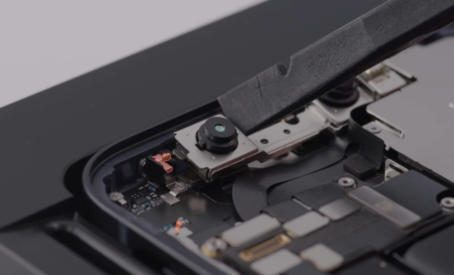 Caution: If the TrueDepth camera is positioned incorrectly, use the black stick to move it away from the grounding clip. Then insert the top edge of the TrueDepth camera under the lip of the enclosure.