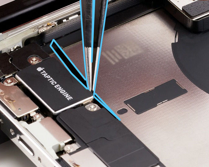 Important: Ensure that a new super screw is installed in the top right corner of the Taptic Engine.