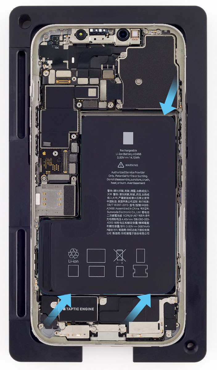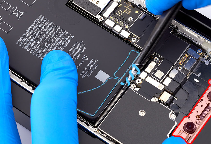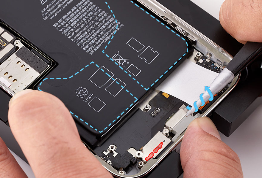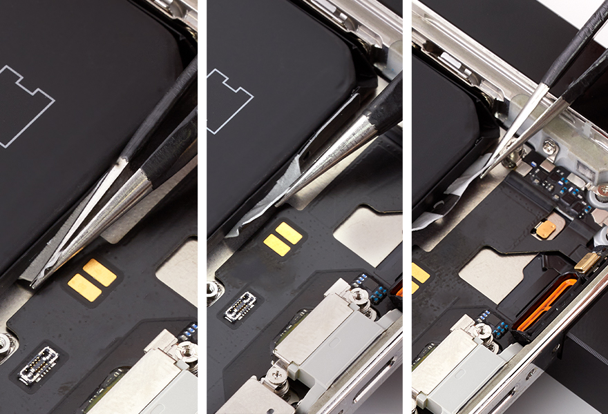 Caution: When using the black stick to remove the battery from the enclosure, don’t damage the flex cables. Don’t scrape, rip, tear, or otherwise damage the polyester film or other areas. If damage occurs, replace the iPhone.