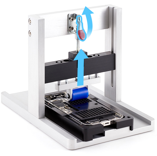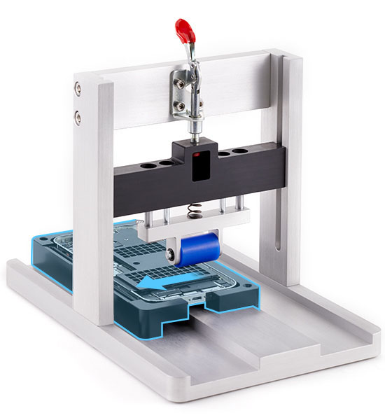 Position the repair tray and enclosure onto the battery press with the right slot over the pin.