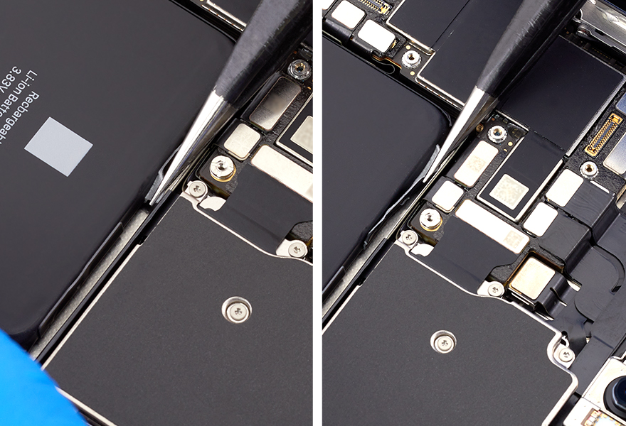 Important: If the battery adhesive tab or strip breaks off and you can still see it, attempt to retrieve it with the tweezers. Wrap the tab or strip around the tweezers and repeat step 11. If you can’t see the tab or strip, continue to step 12.