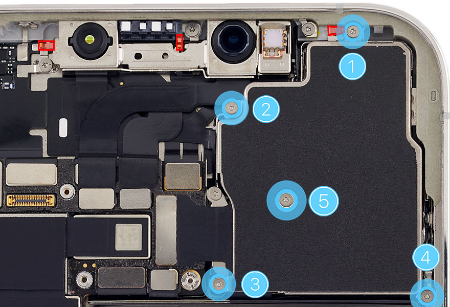 Use a torque driver and the Micro stix bit to remove the five trilobe screws from the camera cowling in the order shown. Hold the camera cowling in place as you remove the center screw (5). Set aside the screws.