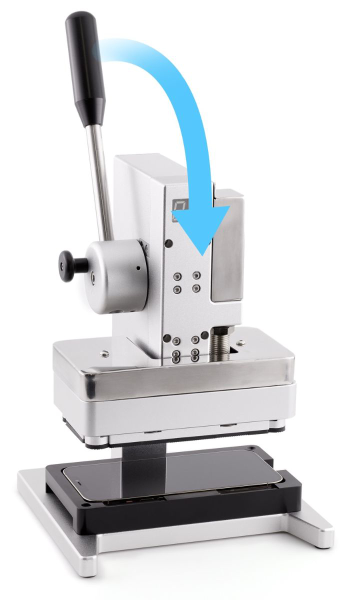 Position the repair tray with the iPhone in the display press. Pull down the lever until the display press locks.