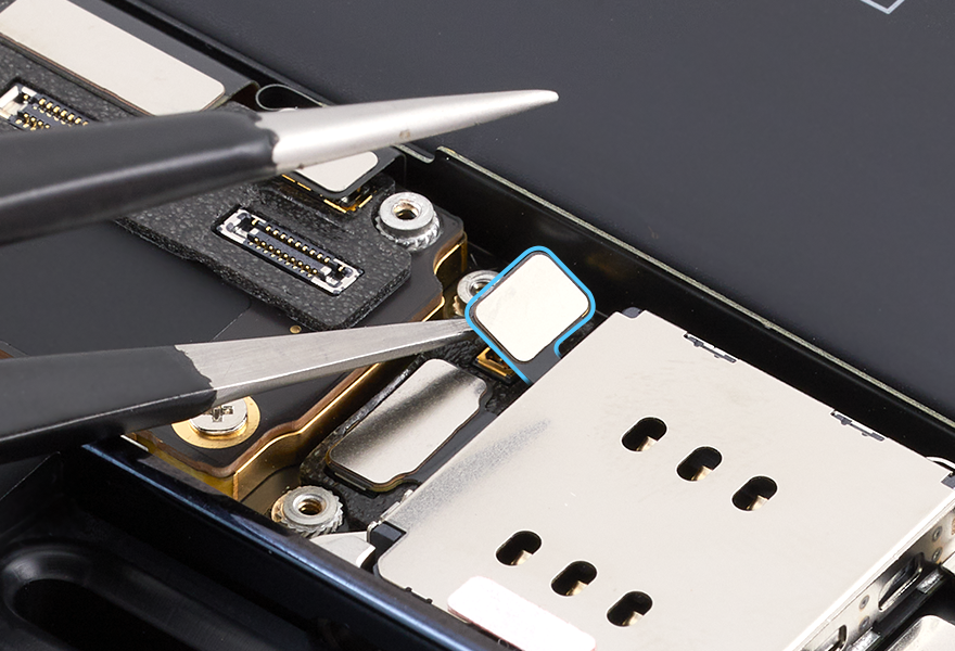 Use ESD-safe tweezers to remove the SIM reader connector cowling. Save the cowling for reassembly.