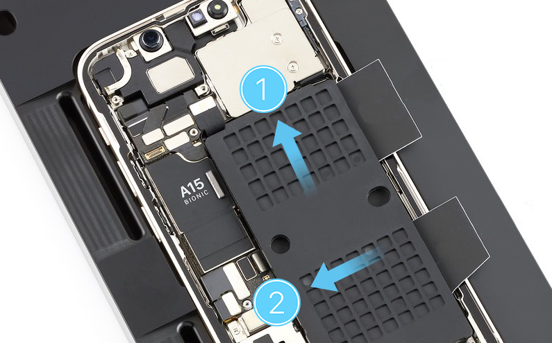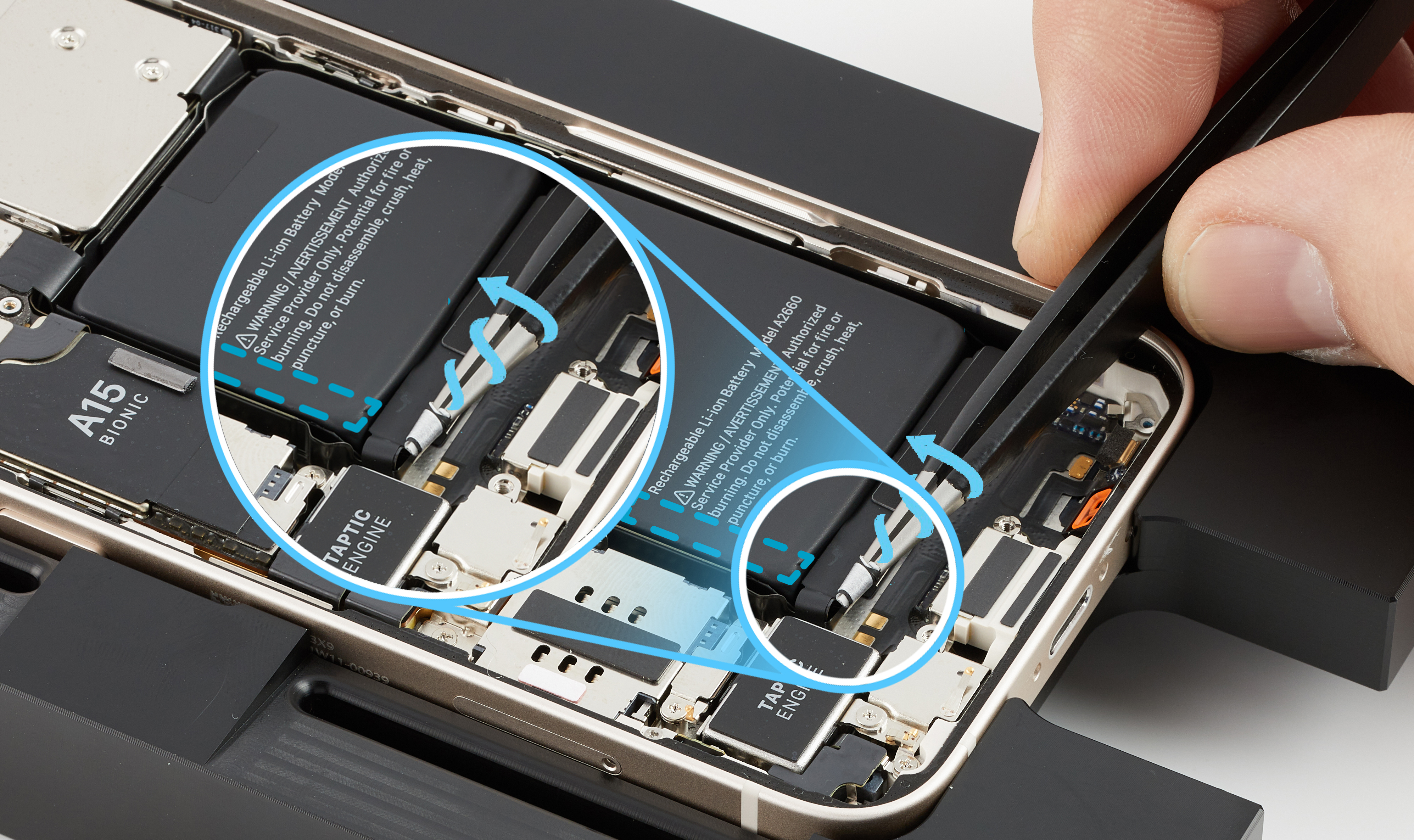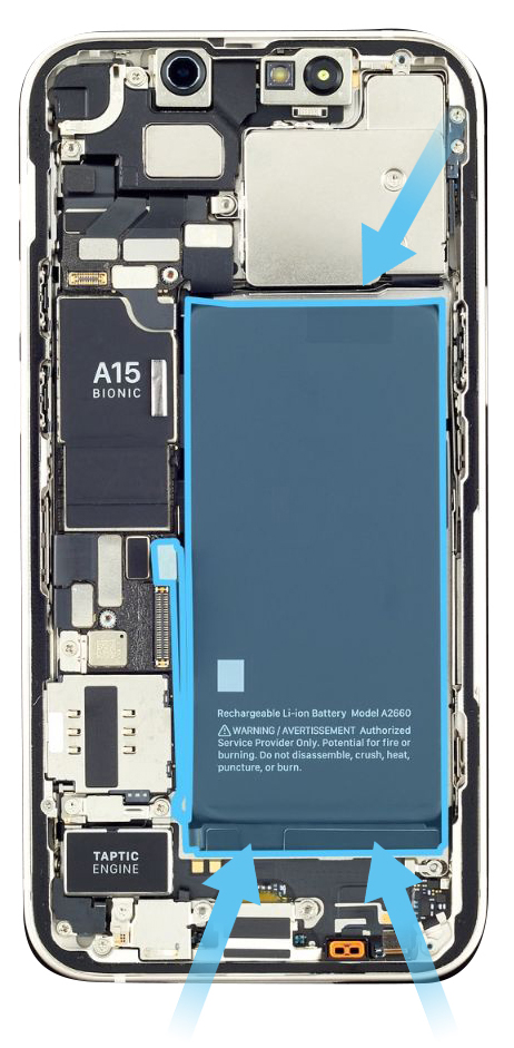 Caution: When using the black stick to remove the battery from the enclosure, don’t damage the flex cables. Don’t scrape, rip, tear, or otherwise damage the polyester film or other areas. If damage occurs, replace the iPhone.