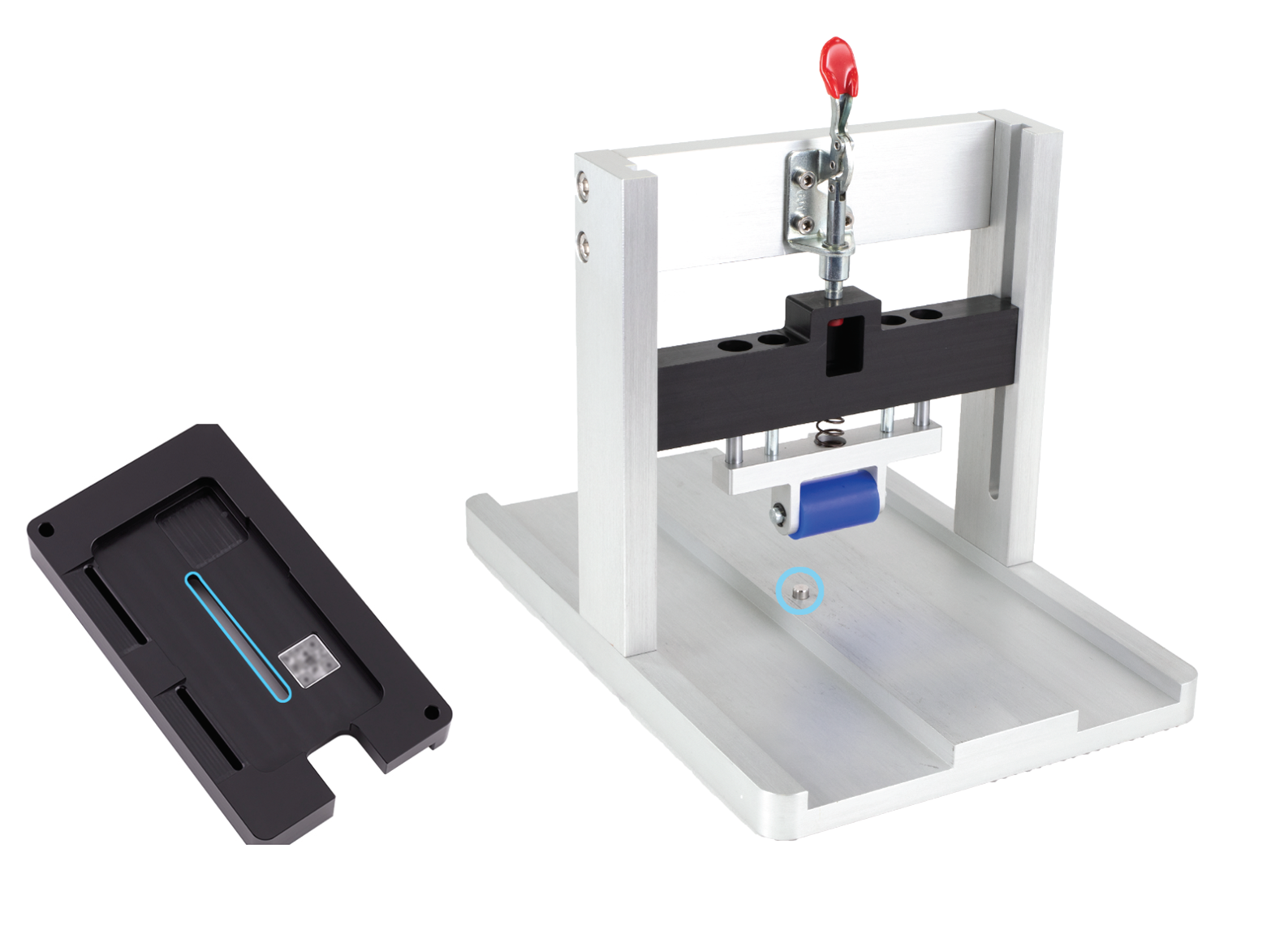 The center of the repair tray has a slot. Position the repair tray and enclosure onto the battery press with the slot over the pin.