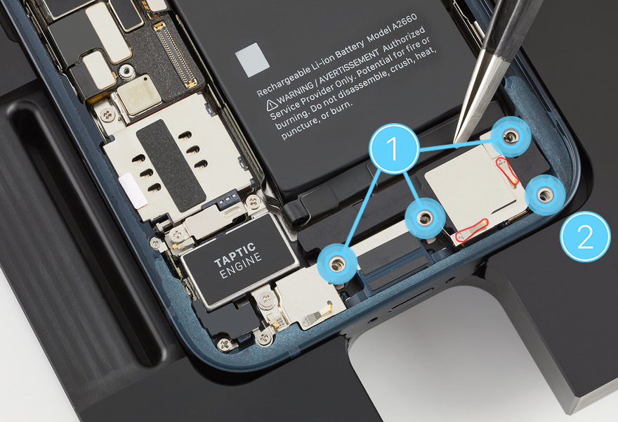 Use the gray torque driver and JCIS bit to install four new crosshead screws (923-06670) (1) (923-06671) (2) into the bottom speaker. Press the bottom speaker down as you install the screws.