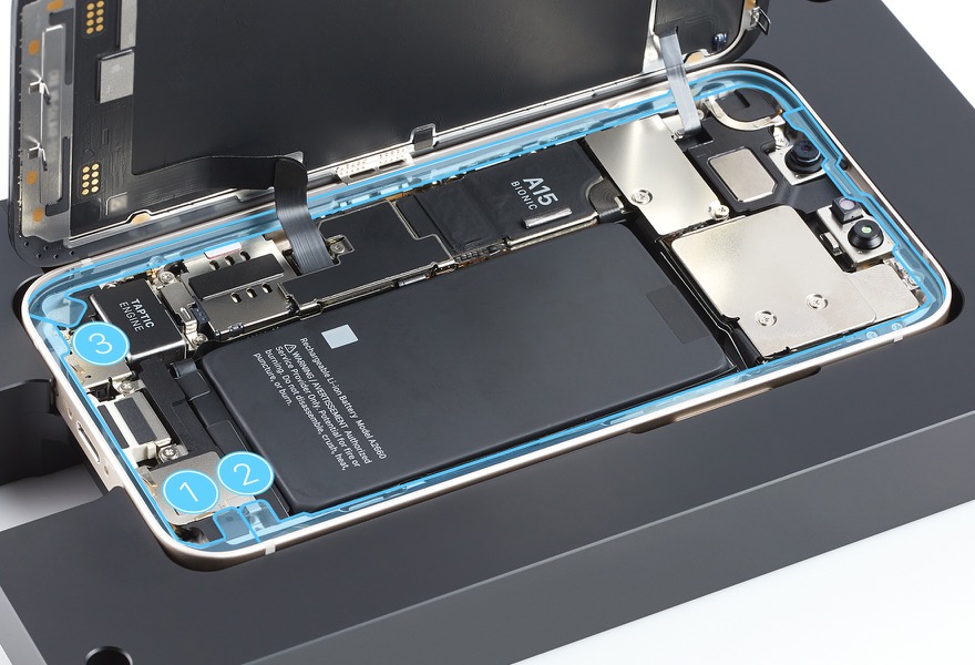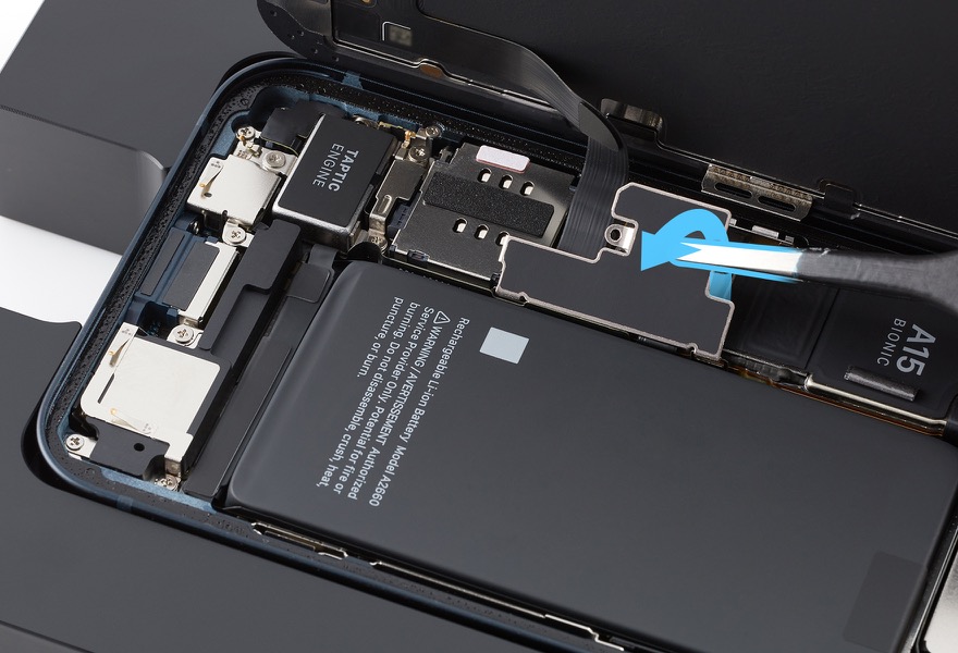 Caution: You must disconnect the battery flex cable first to ensure that the iPhone remains turned off.