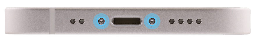 Use a torque driver and the Torx security bit to remove the two security screws, one from each side of the Lightning connector. Set aside the screws.