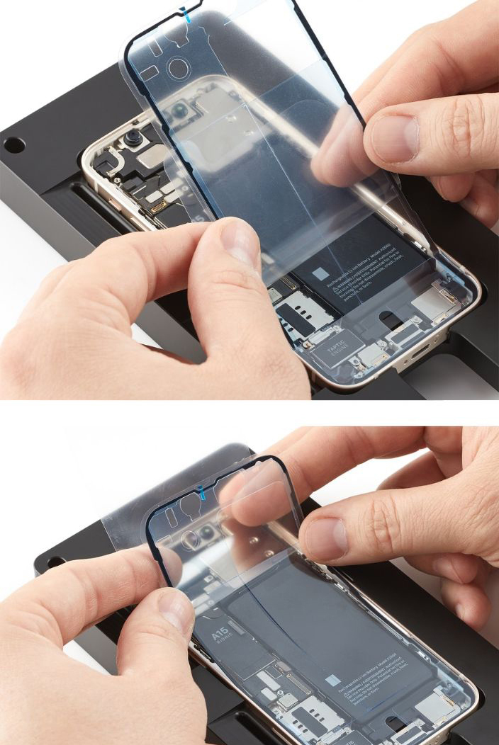 If you’re installing a replacement display, peel the protective liner from the top and underside of it.
