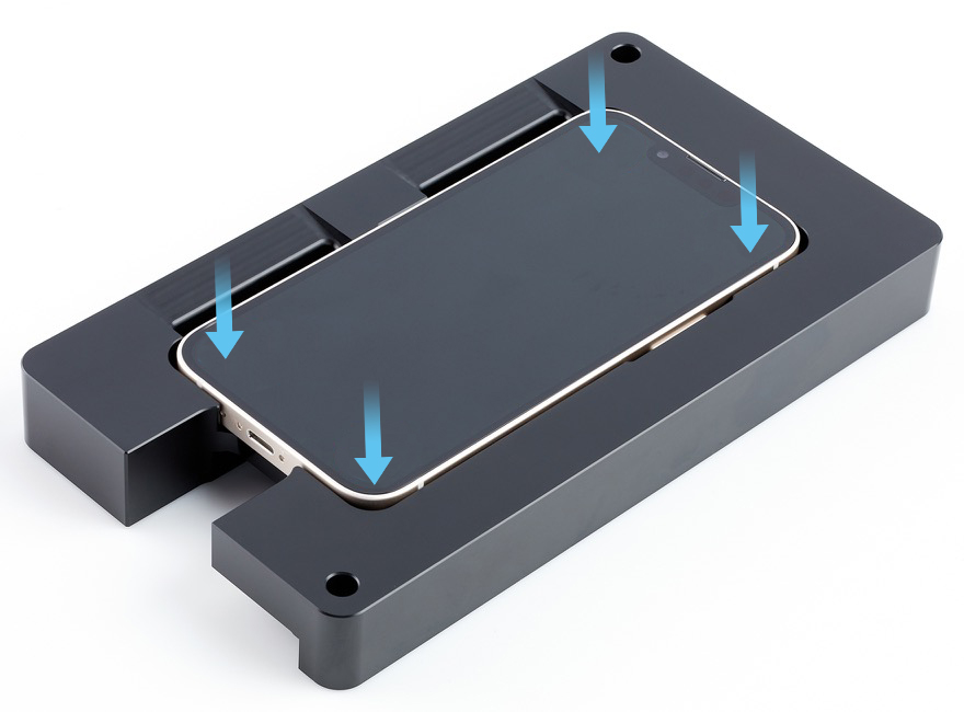 Gently insert the iPhone into the heated display pocket with the display faceup and the Lightning connector facing the bottom of the pocket.