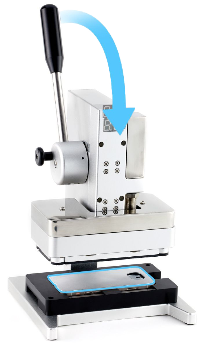 Position the repair tray with the iPhone in the display press. Pull down the lever until the display press locks.