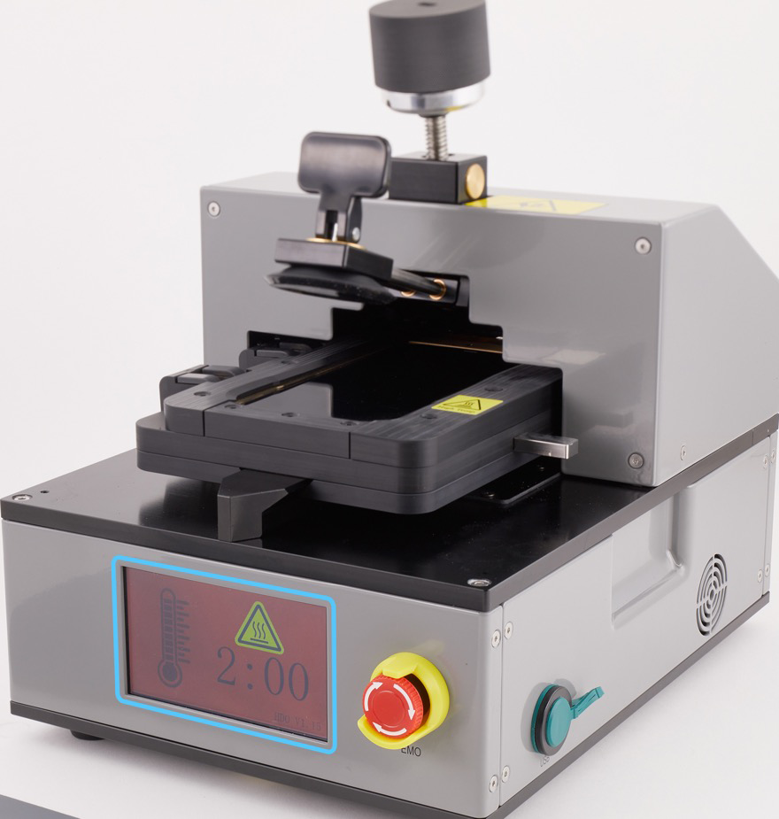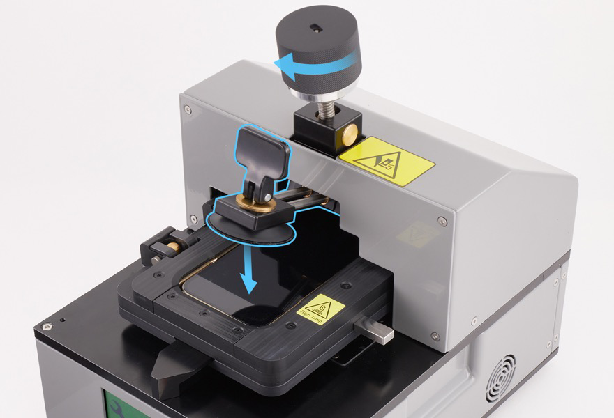 Position the repair tray with the iPhone in the display press. Pull down the lever until the display press locks.