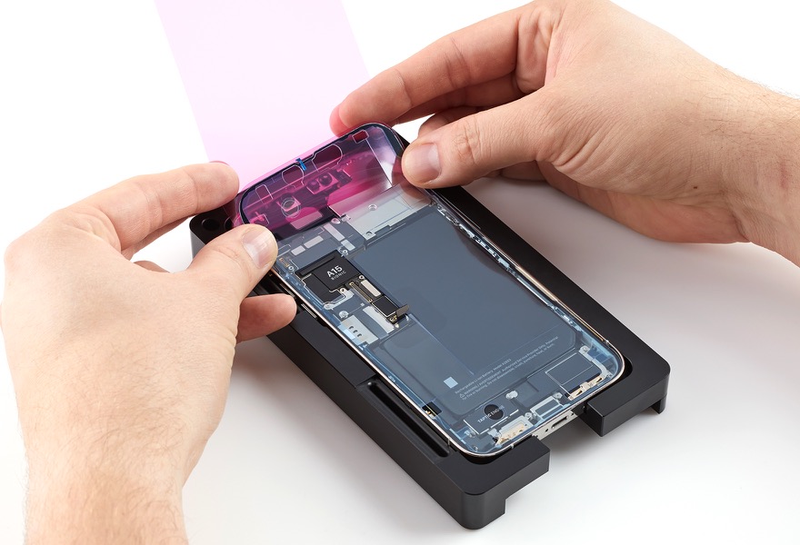 Place the iPhone into the repair tray with the display faceup and the Lightning connector facing the cutout. Remove the gloves.