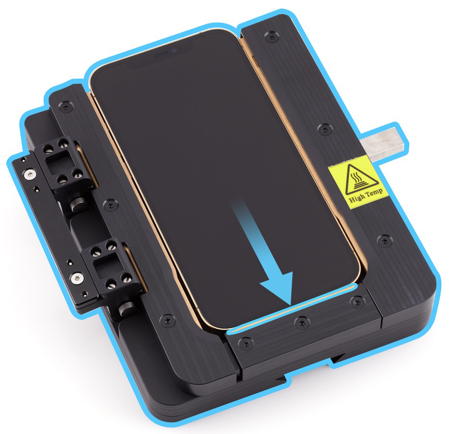 Take the iPhone out of the repair tray. Then gently insert the iPhone into the heated display pocket with the display faceup and the Lightning connector facing the bottom of the pocket.
