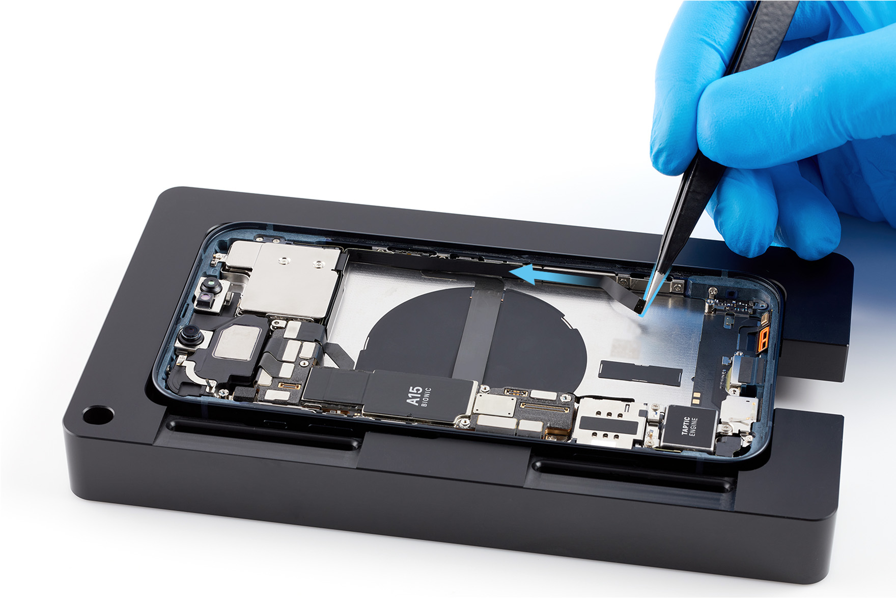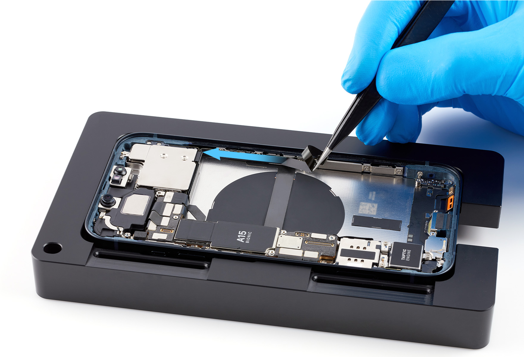 Put on the gloves and place the enclosure in the repair tray with the Lightning connector facing the cutout.