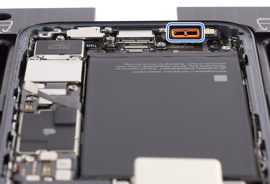 Use a torque driver and the Micro stix bit to remove the trilobe screw (2) from the bottom speaker. Set aside the screw.