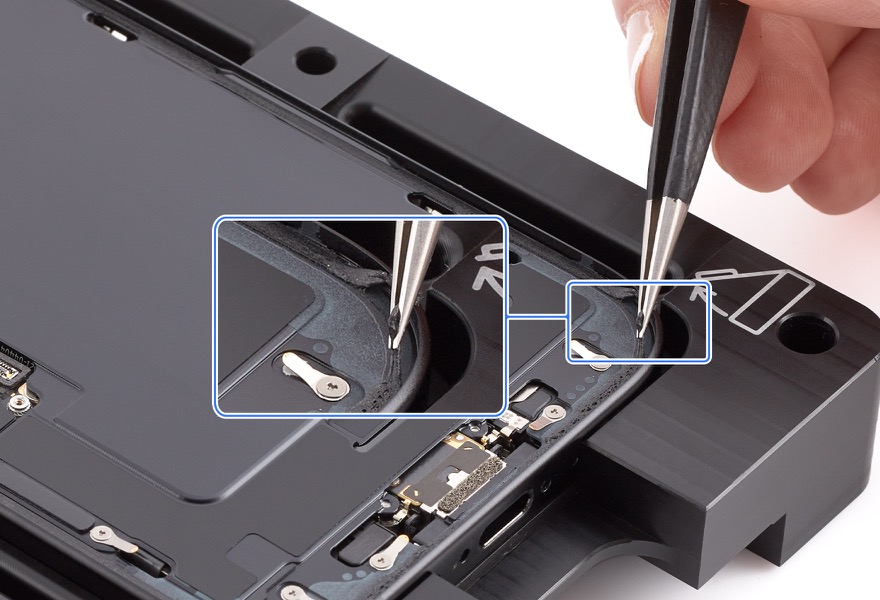 Use ESD-safe tweezers to position the new grounding spring. Then use the black torque driver and the Micro stix bit to install one new trilobe screw (923-10032) into the grounding spring.