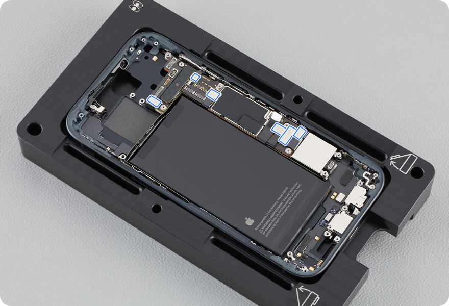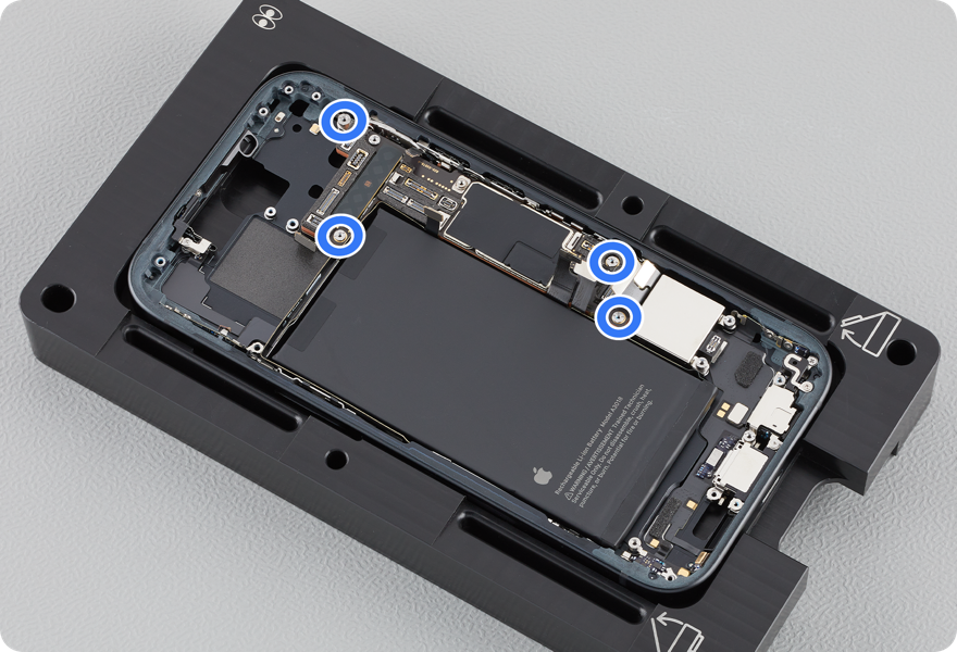 Phone 15 Plus: Use the orange torque driver and super screw bit to install four new super screws: