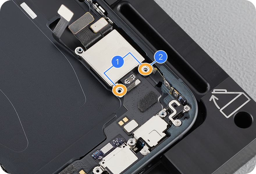 iPhone 15: Remove the two super screws from SIM assembly (1). Set aside the screws.