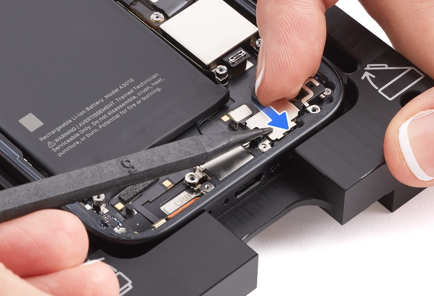 Use ESD-safe tweezers to peel the protective liner from the adhesive on the main microphone.