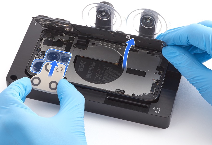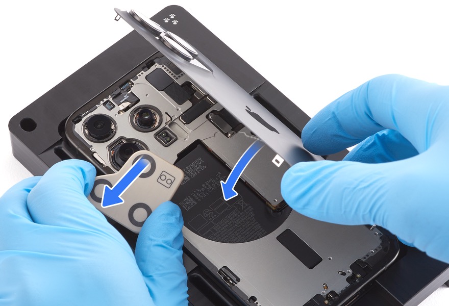Place the iPhone into the repair tray with the camera faceup and the USB-C connector facing the cutout. Remove the gloves.