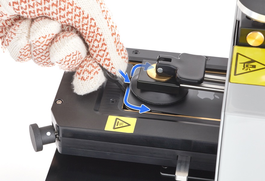 Put on the heat-resistant gloves. Align the cutout on the bottom of the pocket with the rail on the fixture. Slide the pocket with the iPhone onto the rail.