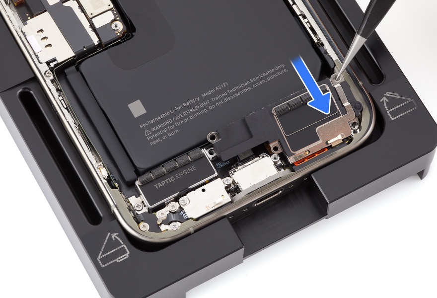 Use ESD-safe tweezers to grasp the top right screw hole on the top of the bottom speaker. Slightly tilt up the bottom speaker. Then use the black stick to separate the battery shim from the bottom speaker.