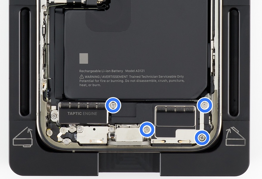 Use a torque driver and the JCIS bit to remove four crosshead screws from the bottom speaker. Set aside the screws.
