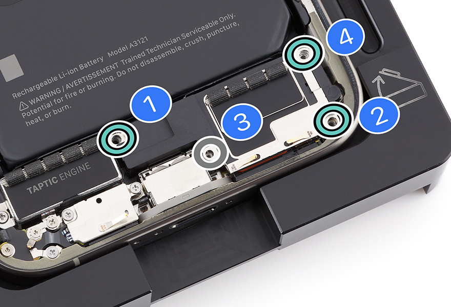 Set the torque on the 10–34 Ncm adjustable torque driver to 14.5 Ncm. Use the adjustable torque driver and adjustable torque driver JCIS bit to install one new crosshead screw (923-10047) (1) into the bottom speaker.