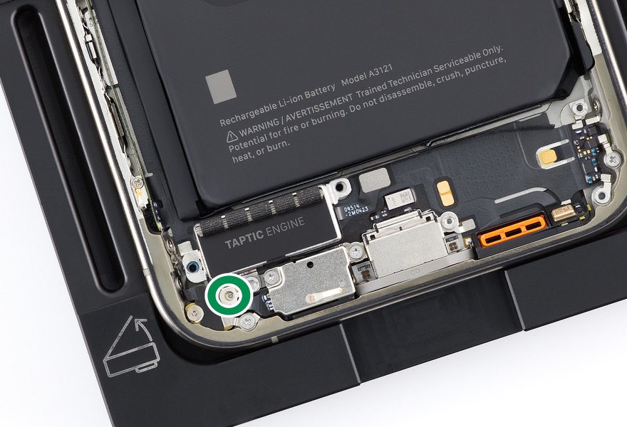 Position the grounding spring in the enclosure. Then use the green torque driver and Micro stix bit to install one new trilobe screw (923-09964) into the Taptic Engine.