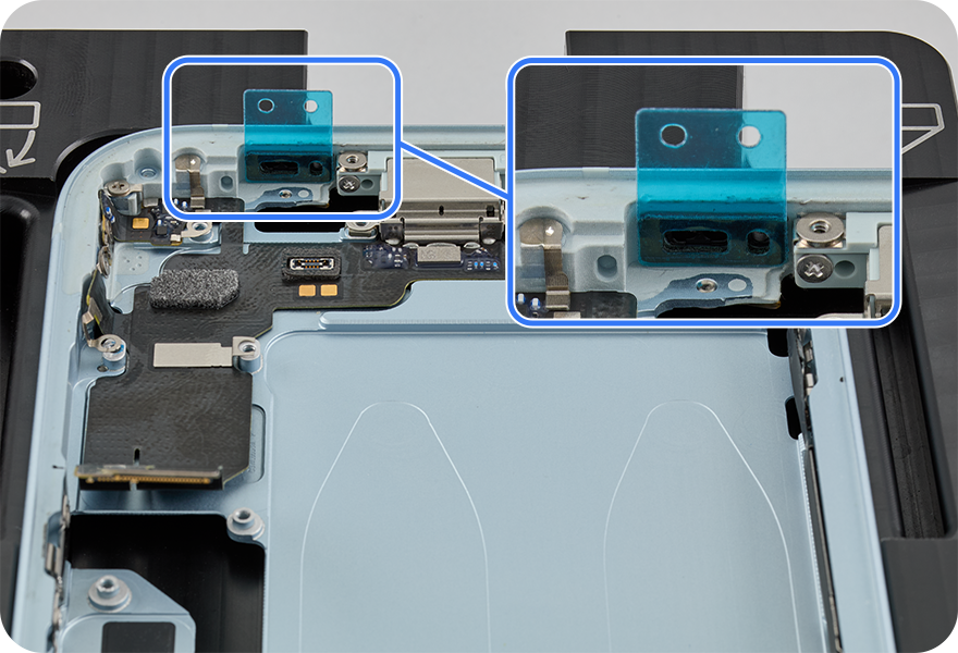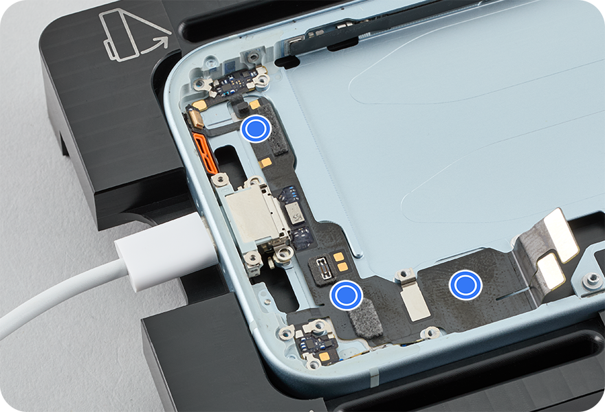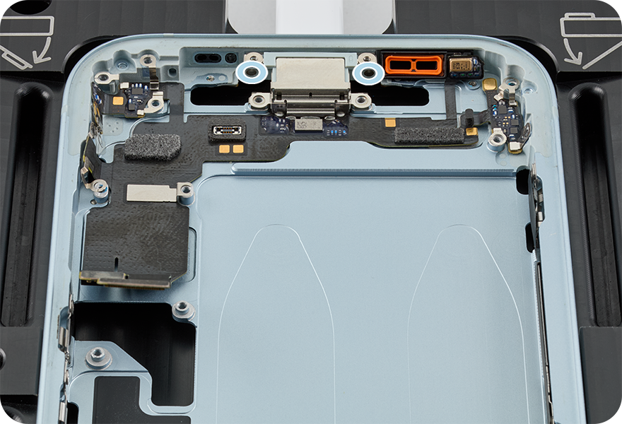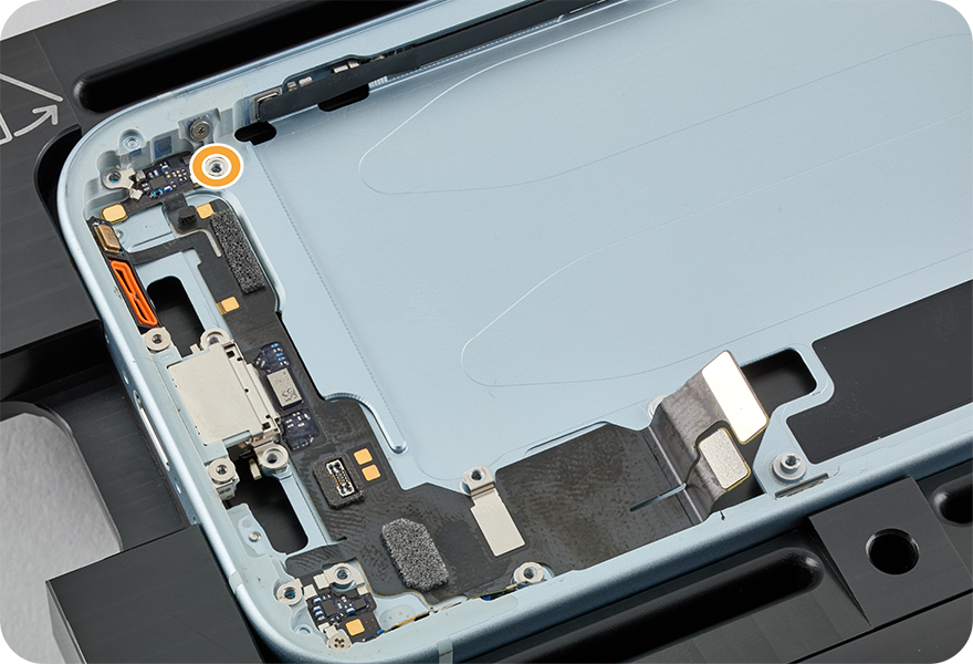 Align the screw holes. Then press the USB-C connector flex cable to the enclosure, paying close attention to the areas where adhesive is present.