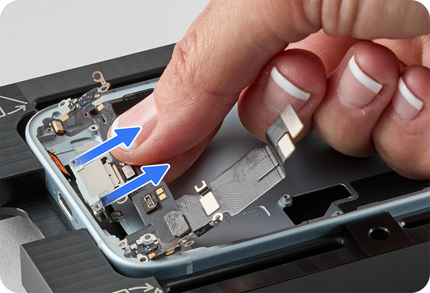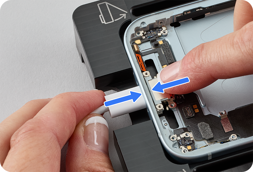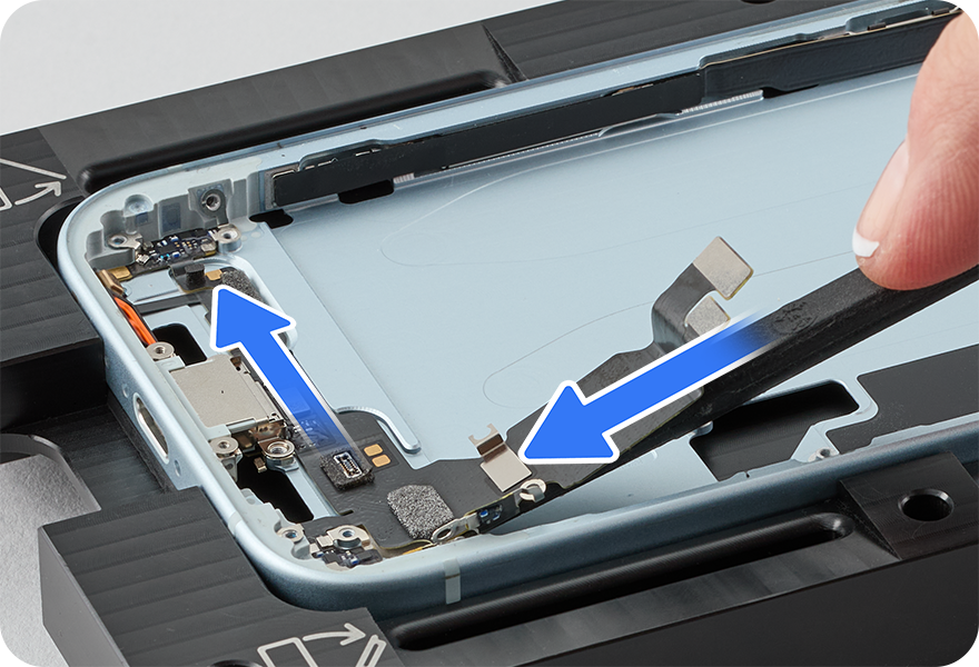 Lift the end of the USB-C connector flex cable as shown and peel the flex cable off the enclosure. Then remove the USB-C connector from the enclosure.