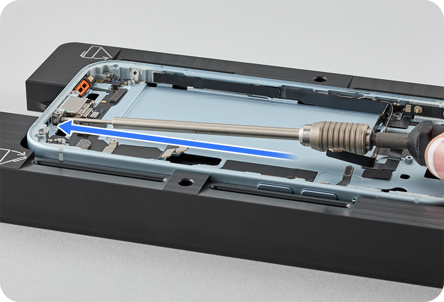 Use a torque driver and the Micro stix bit to remove the three trilobe screws from the USB-C connector. Set aside the screws.
