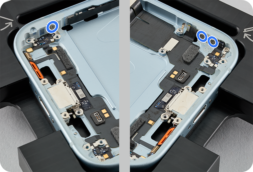 Use a torque driver and the long JCIS bit to remove two crosshead screws from the USB-C connector. Set aside the screws.