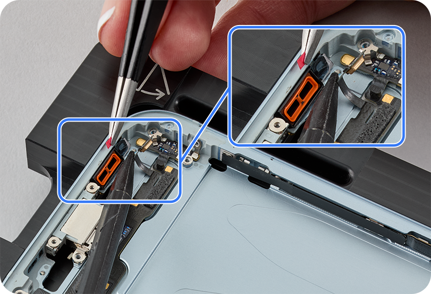 Use ESD-safe tweezers to remove all residual adhesive from the enclosure, the microphone 4 area, and the USB-C connector port. Use ethanol wipes or IPA wipes to clean these areas.