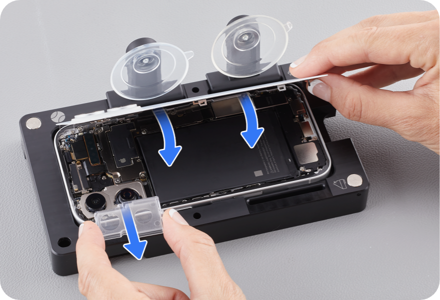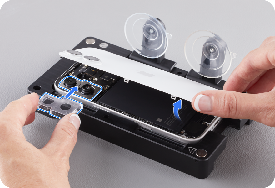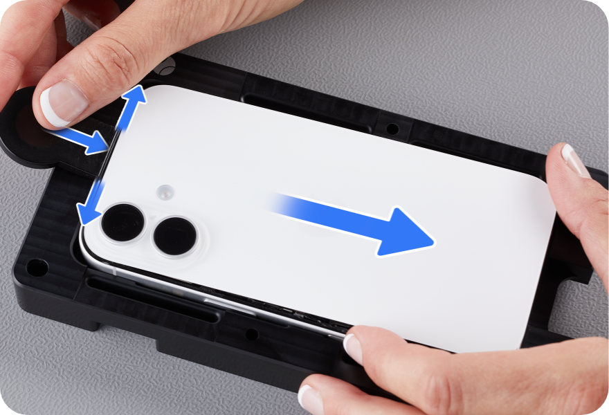 Using the adhesive cutter, finish cutting along the sides and top of the iPhone until the back glass is free. Then, open the iPhone by tilting the back glass onto the repair tray suction cups.