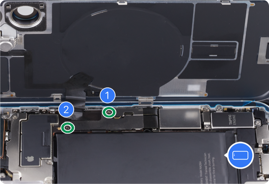 Press the end of the back glass flex cable (1) to the connector. Press the end of the battery flex cable to the connector (2).
