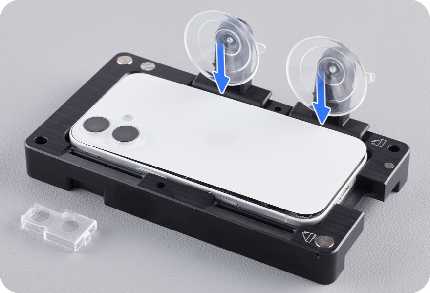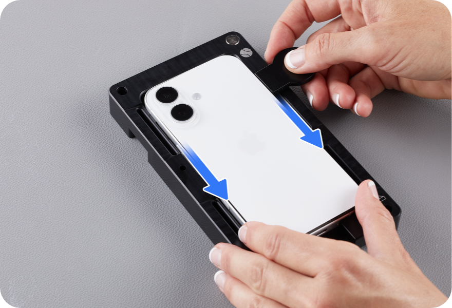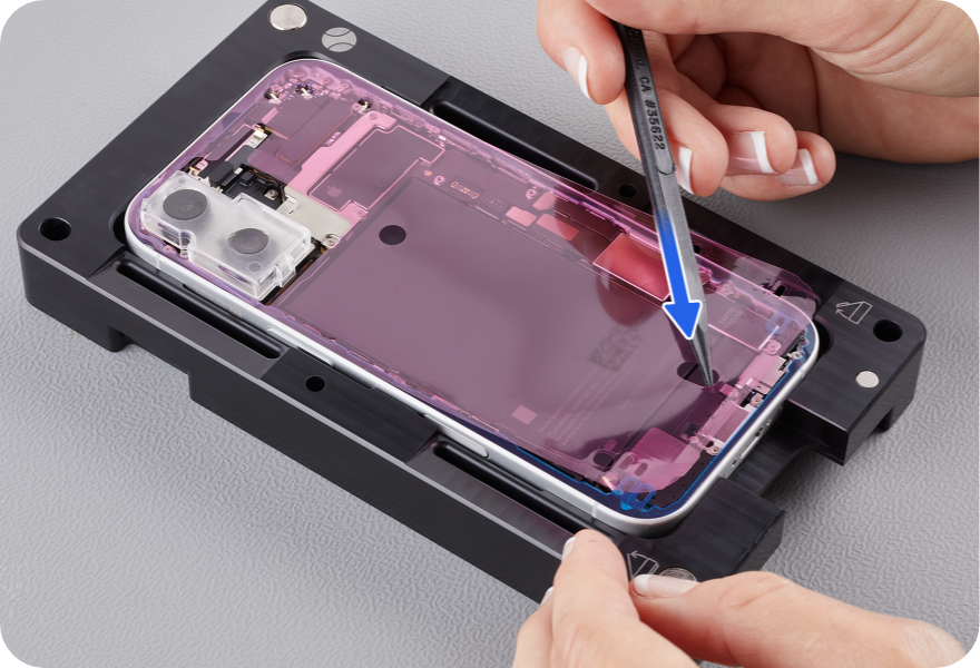 Remove the iPhone from the heated display removal fixture and place the iPhone in the repair tray with back glass faceup and the USB-C connector facing the cutout.
