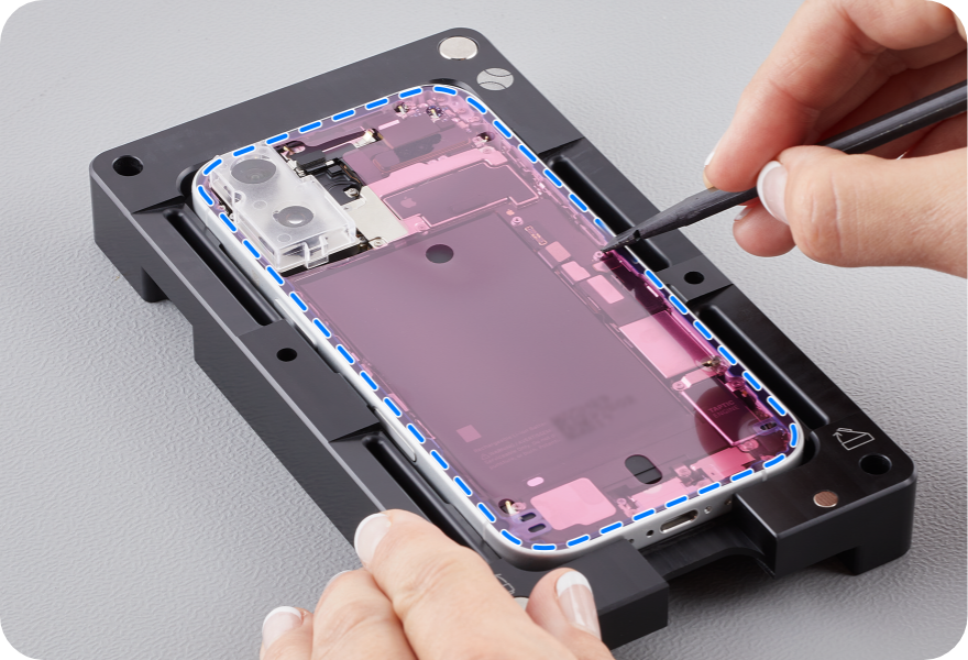 Use the adhesive removal tool or the black stick to lift the adhesive from the enclosure. Use the ESD-safe tweezers to pull the adhesive. Repeat this process until all the adhesive is removed from the perimeter of the enclosure.