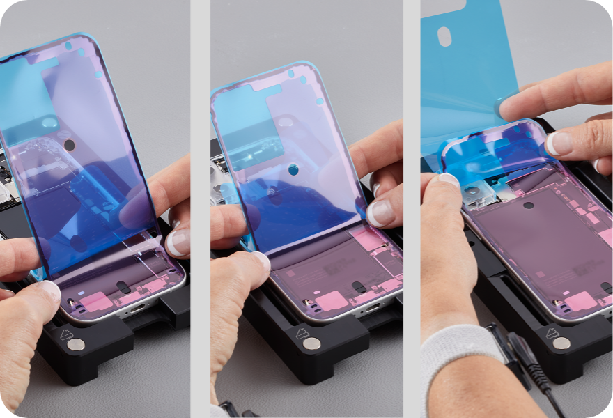 The replacement back glass adhesive has a top release liner, a middle release liner, and a bottom release liner. Grasp the tab on the bottom release liner. Then slowly pull the bottom release liner out from under the adhesive while pressing the adhesive onto the enclosure.