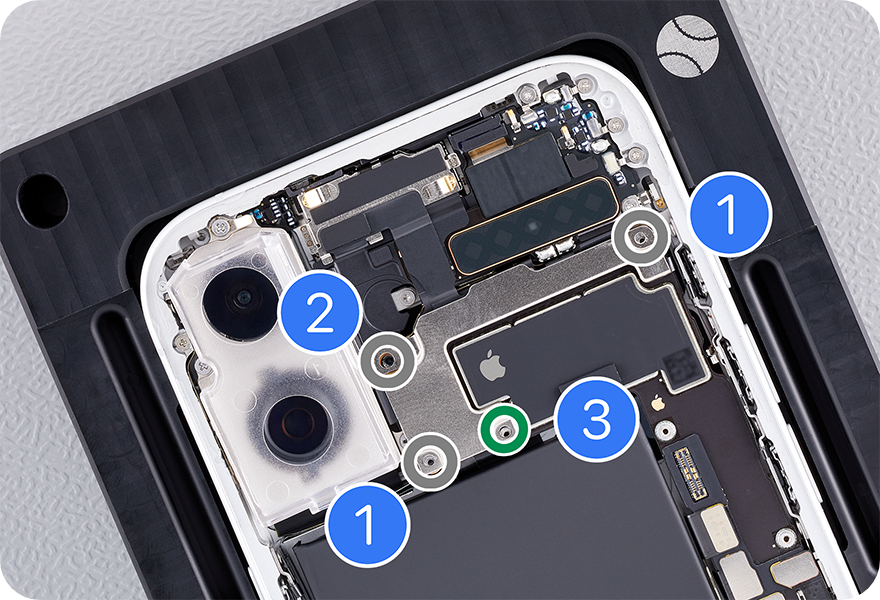 Use a torque driver and the fixed driver JCIS bit to remove the three crosshead screws (2) from the TrueDepth camera cowling. Set aside the screws.