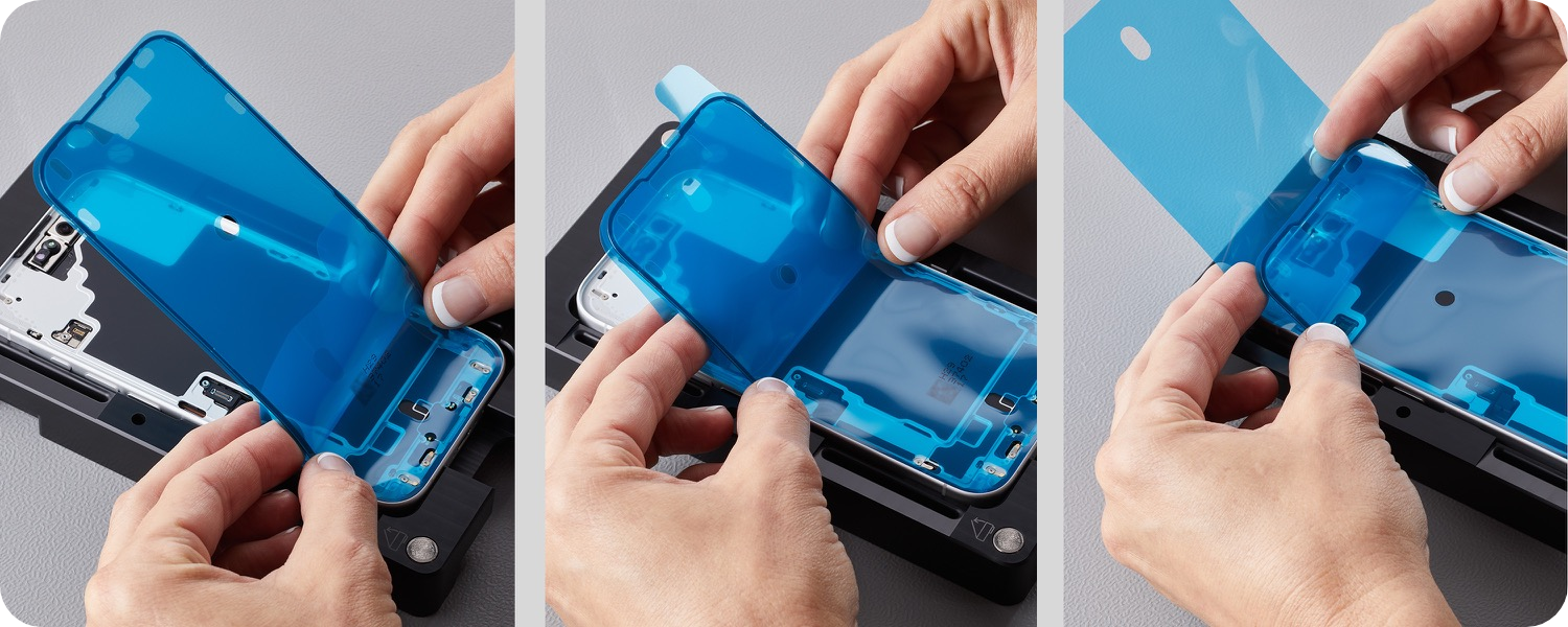 The replacement display adhesive has a top release liner, a middle release liner, and a bottom release liner. Grasp the tab on the bottom release liner. Then slowly pull the bottom release liner out from under the adhesive while pressing the adhesive onto the enclosure.