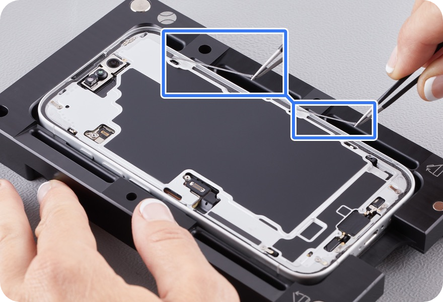 Use the black stick or ESD-safe tweezers to tap the replacement top speaker grille into place, as shown in the right image.